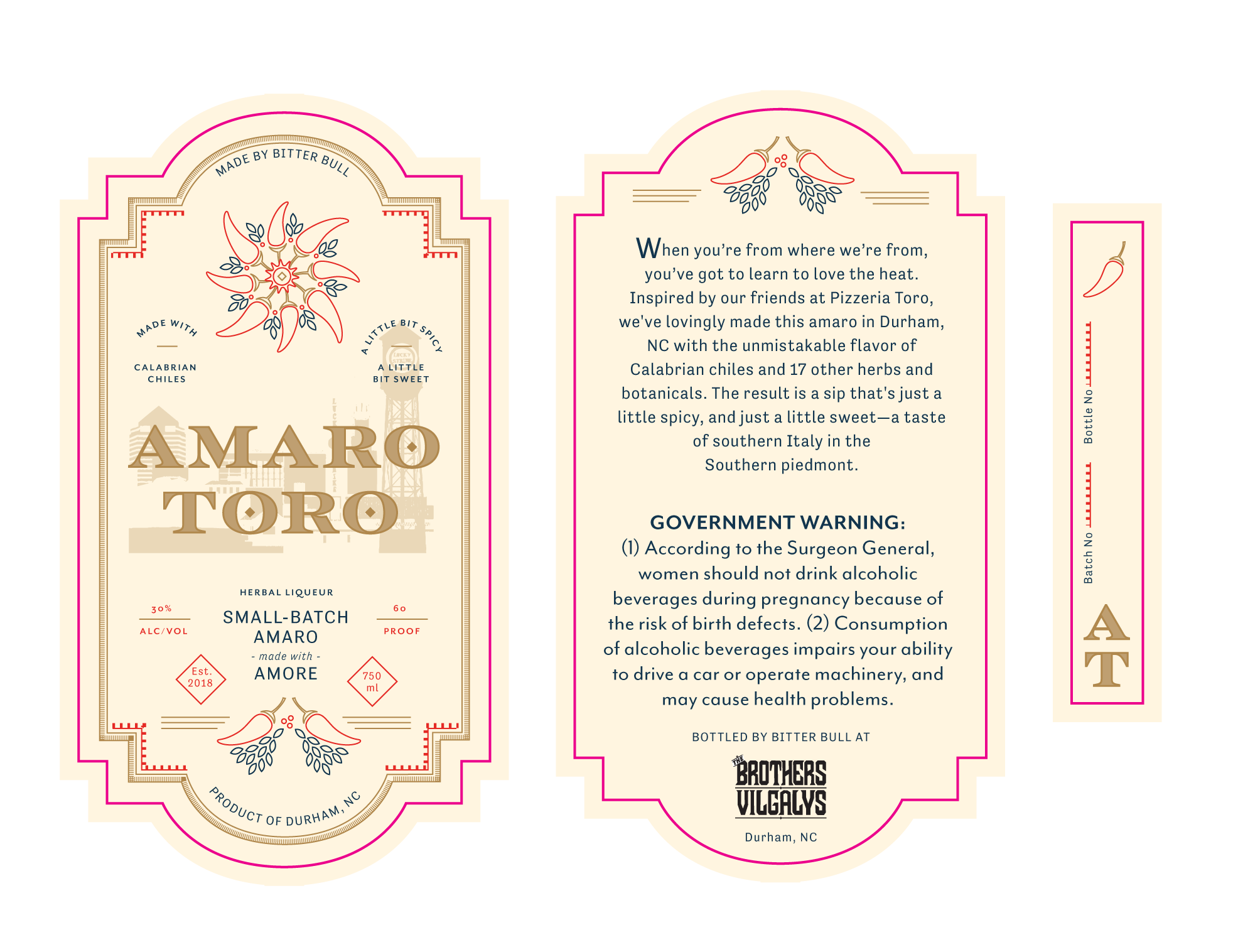A collaboration between Durham's Brothers Vilgalys Spirits and the beloved local restaurant Pizzeria Toro, Amaro Toro is a small-batch herbal liqueur built around Calabrian chiles and 17 other herbs and botanicals — spicy, sweet, and rooted equally in southern Italy and the Southern Piedmont.