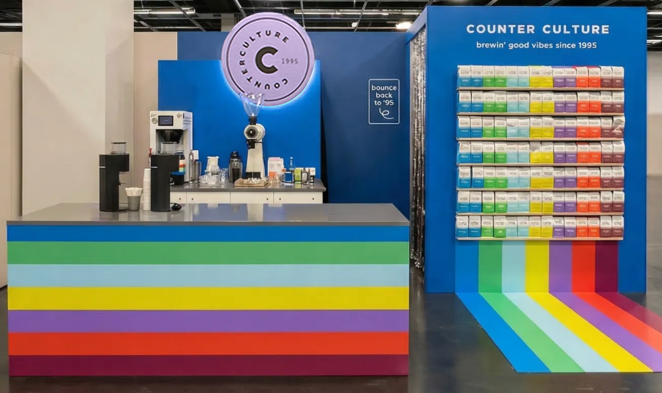 For the 2024 booth, Counter Culture's theme was showcasing their colorful packaging rainbow, and that they had been in business since 1995.